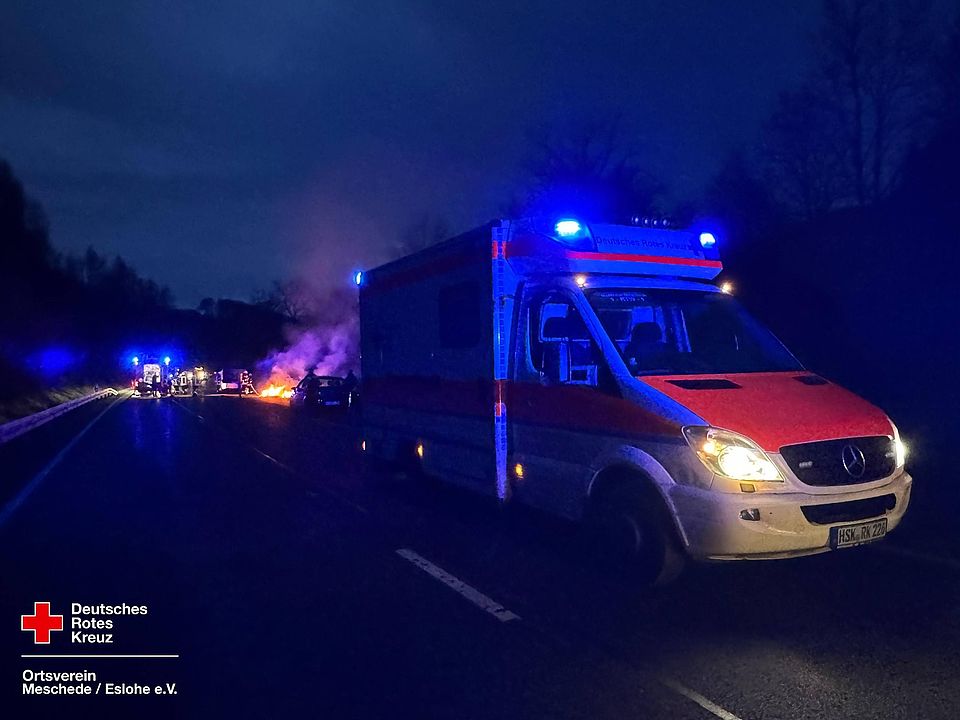 Auf der Rückfahrt zur DRK-Fahrzeughalle kam die RTW-Besatzung an einem PKW-Brand vorbei. Erstmaßnahmen wurden eingeleitet und der Fahrer des PKW betreut. Die Feuerwehr war schnell vor Ort.